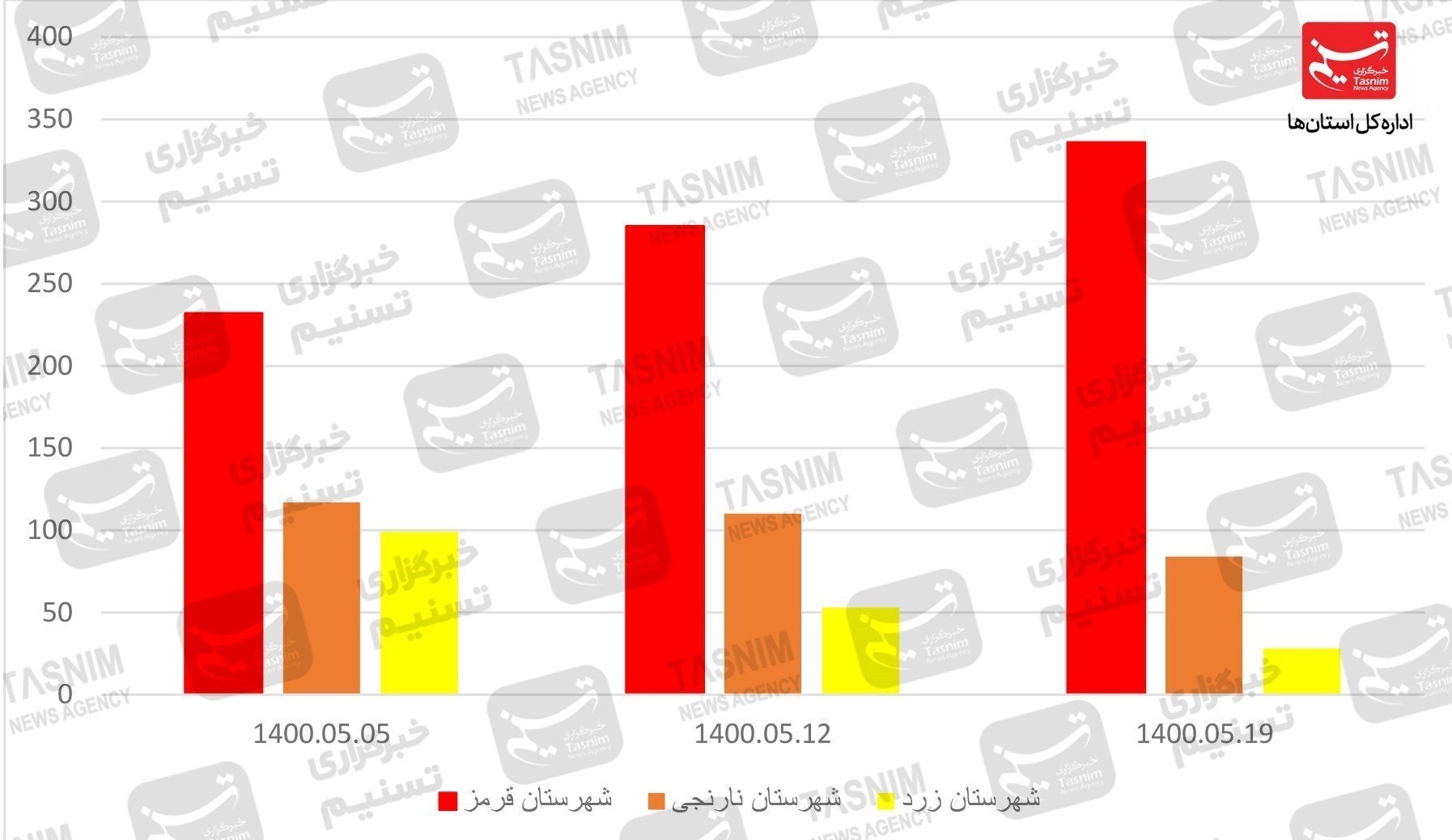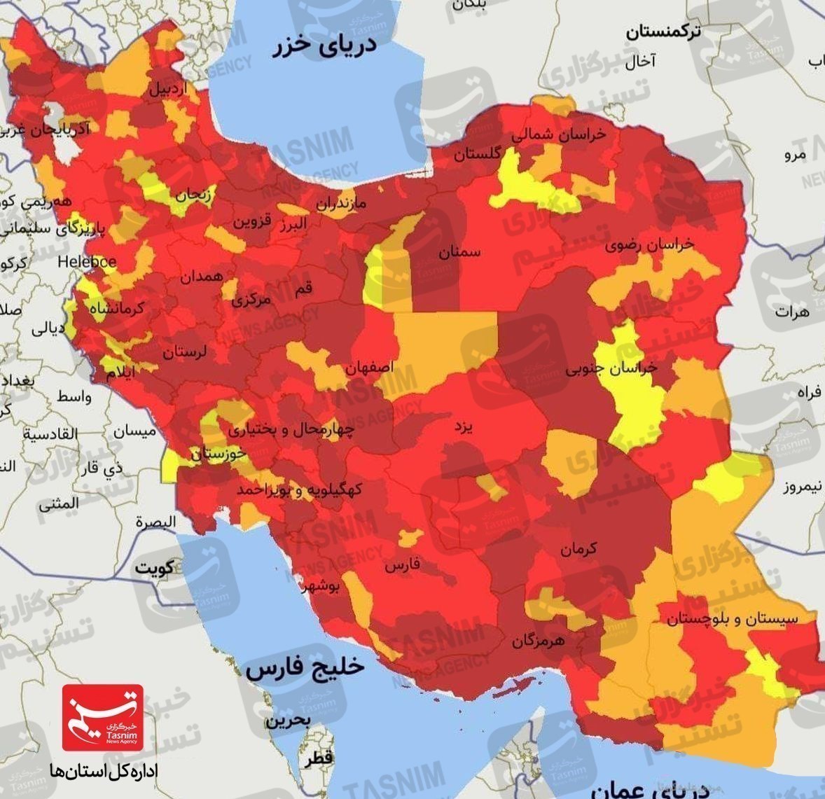 براساس بررسیهای انجام شده و شاخصهای مورد نظر وزارت بهداشت از امروز 16 مردادماه 1400 علاوه بر شهرهای قبلی، این شهرها قرمز خواهند شد: مراغه، مرند، ملکان، هریس (آذربایجان شرقی)، بوکان، پلدشت، سلماس، میاندوآب، نقده (آذربایجان غربی)،بوئین و میاندشت، تیران و کرون،نطنز (اصفهان)،ایوان (ایلام)،دیر (بوشهر)، بن، سامان، کوهرنگ، لردگان (چهارمحال و بختیاری)، بشرویه (خراسان جنوبی)، بردسکن، تایباد،تربت حیدریه، جغتای،خلیل آباد،خواف، فریمان،فیروزه، کلات، گناباد، نیشابور (خراسان رضوی)، فاروج، گرمه (خراسان شمالی)، آغاجاری، امیدیه، ایذه، باغ ملک، دزفول، رامشیر، کارون، مسجد سلیمان (خوزستان)، خدابنده، طارم (زنجان)، بمپور، سیب و سوران (سیستان و بلوچستان)، اقلید، بوانات، خرم بید، خفر، رستم، سروستان، کوهچنار (فارس)، سقز، قروه (کردستان)، رابر (کرمان)، اسلام آباد غرب، جوانرود، سرپل ذهاب (کرمانشاه)، باشت (کهگیلویه و بویر احمد)، املش (گیلان)، میاندورود (مازندران)، خنداب، فراهان (مرکزی)، ابوموسی، هرمز (هرمزگان)، فامنین (همدان). بهاین ترتیب با توجه آخرین آمار منتشر شده از سوی نرم افزار ماسک هم اکنون 336 شهرستان کشور قرمز، 84 شهرستان نارنجی و 28 شهرستان زرد تعیین شده است.