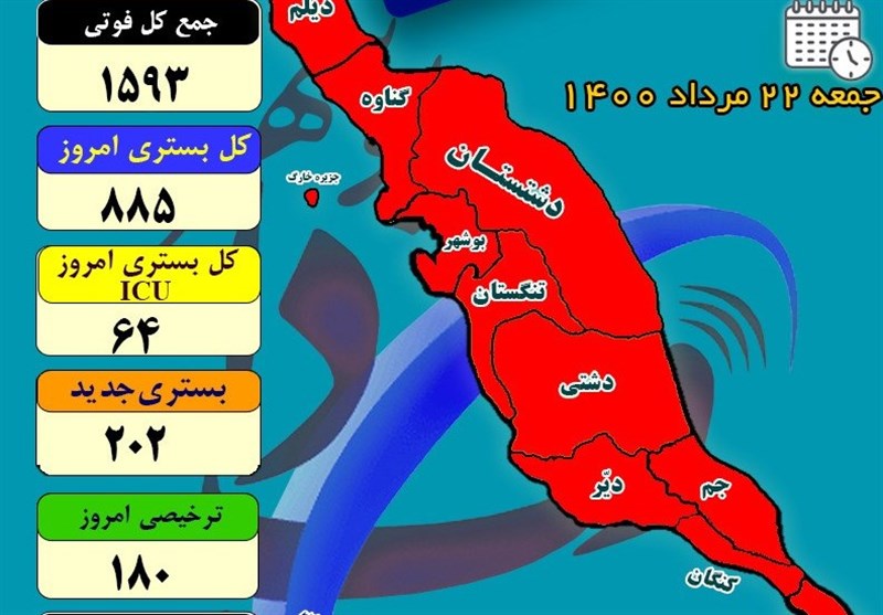 رئیس دانشگاه علوم پزشکی بوشهر با بیان اینکه روزانه بیش از یک‌هزار نفر بیمار مبتلا به کرونا در استان بوشهر شناسایی می‌شود خاطر نشان کرد: در 24 ساعت گذشته 202 بیمار جدید در بخش‌های کرونایی بیمارستان‌های استان بوشهر بستری شدند.
