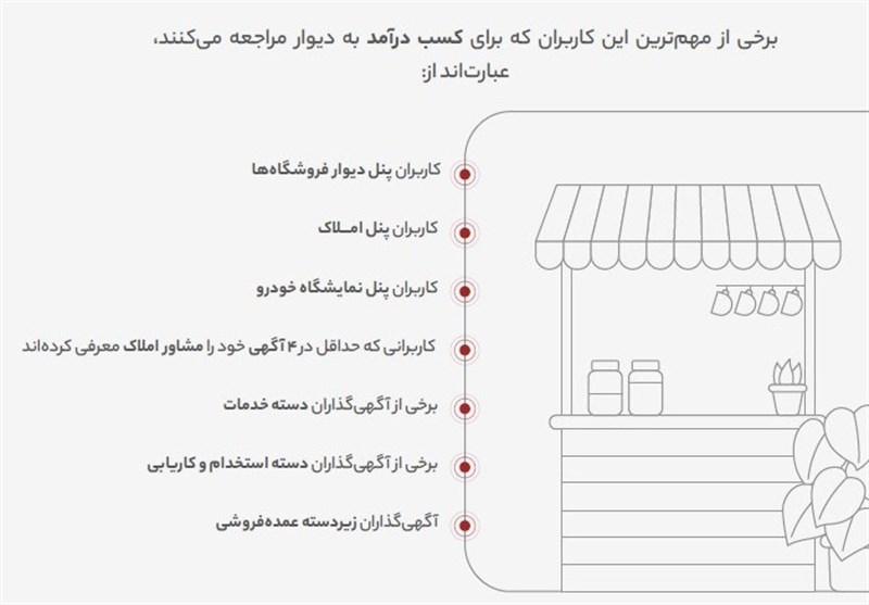 صاحبان کسب و کارهای کوچک زیادی در دیوار حضور دارند که گروهی از آنها بهصورت منظم و گروهی کمتر فعالیت میکنند اما نکته مشترک بین آنها این است که همه برای کسب درآمد دیوار را انتخاب کردهاند. برخی از مهمترین کاربران که با هدف کسب درآمد آگهی میگذارند عبارتاند از کاربران پنل املاک، پنل نمایشگاه خودرو، کاربرانی که خود را مشاور املاک معرفی کردهاند و برخی از کاربران دسته خدمات، استخدام و کاریابی و زیر دسته عمدهفروشی. ناگفته نماند که یکمیلیون و 435 هزار نفر از کاربران دستههایی که به آن اشاره کردیم از طریق دیوار کسب درآمد میکنند.