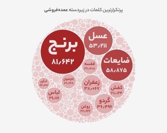 همچنین جالب است بدانید در سالی که گذشت برنج با بیش از 81هزار بار تکرار مقام اول پرتکرارترین واژه در زیر دسته عمدهفروشی را از آن خود کرد. بعد از آن ضایعات با بیش از 58هزار بار و عسل با 53هزار بار مقاوم دوم و سوم را کسب کردند.