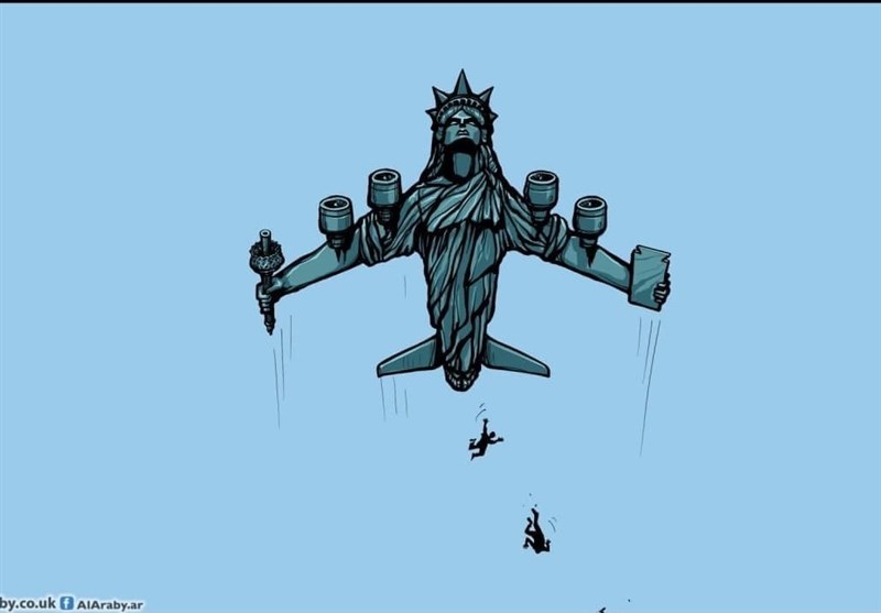 برخی از کاربران در فضای مجازی روز گذشته به بهانه سقوط دردناک دو شهروند افغانستان از یک هواپیمای آمریکایی در فرودگاه بینالمللی کابل، تصویری از یک هواپیمای آمریکایی که از آن بمب و انسان سقوط میکنند طراحی کرده و نوشتهاند «دو دهه در یک تصویر.»