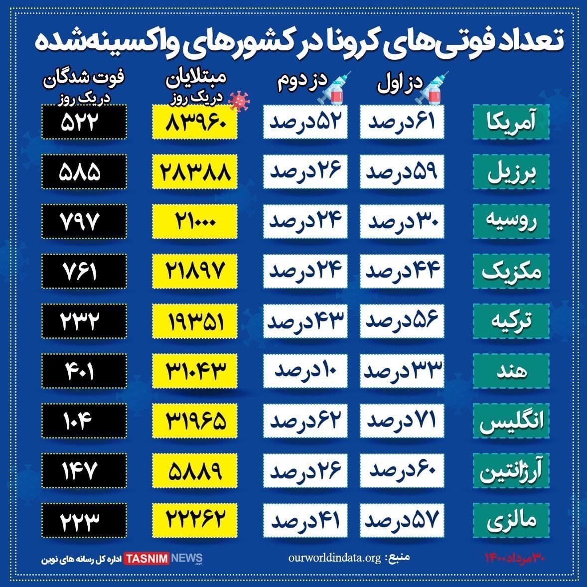 با وجود درصد بالای واکسیناسیون برخی از کشورها هنوز آمار مرگ و میر ناشی از ابتلا به ویروس کرونا در این کشورها شمار زیادی است.
