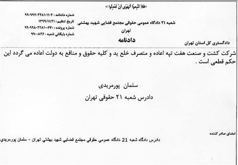 شعبه 21 دادگاه عمومی حقوقی مجتمع قضائی شهید بهشتی، رأی نهایی را آخر وقت اداری دیروز دوشنبه( یکم شهریور) صادر کرده است.