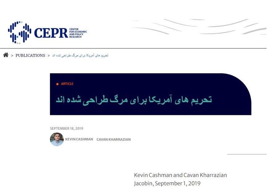 در پیوند با همین سنخ مسایل، دو تحلیلگر آمریکایی، کوین کَشمن و کاوان خرازیان، برای مقالهای که در سپتامبر 2019 برای مرکز پژوهشهای اقتصادی و سیاسی (CEPR) نوشتند، این عنوان را انتخاب کردند: «تحریمهای آمریکا برای مرگ طراحی شدهاند»؛