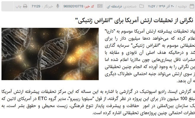 حال این نکته را در نظر بگیریم که همگام با تحولات شگرف حوزه علم و فناوری در دستکم دو دهه گذشته، قدرتهای جهانی، سرمایهگذاری عظیم و حیرتآوری روی حوزههای جدید تسلیحاتی مبتنی بر همین تحولات شگرف صورت دادهاند. «دارپا» (آژانس پروژههای پژوهشی پیشرفته دفاعی)، از بخشهای بسیار مهم و فوقاستراتژیک پنتاگون (وزارت جنگ ایالات متحده)، بخش مهم و بهشدت محرمانهای از تحقیقات و مطالعات خود را روی تسلیحات مبتنی بر ژنتیک و علوم سلولی ـ مولکولی و بیوتکنولوژی متمرکز کرده است. در آذرماه سال 96 بود که رسانههای آمریکایی از سرمایهگذاری دهها میلیون دلاری دارپا روی فناوری «انقراض ژنتیکی» گونههای جانوری خبر دادند. محمل یا پوشش این پروژه از بین بردن حشرات یا آفتهای کشاورزی است، لیکن همان زمان بسیاری از کارشناسان علمی و نظامی هشدار دادند که از آنجا که «دارپا» یک آژانس نظامی، با عملکرد بهکلی سرّی، با بودجههای نامشخص و بدون هیچگونه شفافیت و پاسخگویی است، بهسختی میتوان از عدم سوق یافتن چنین پروژههایی بهسمت تبدیل به سلاحی جنگی اطمینان داشت.