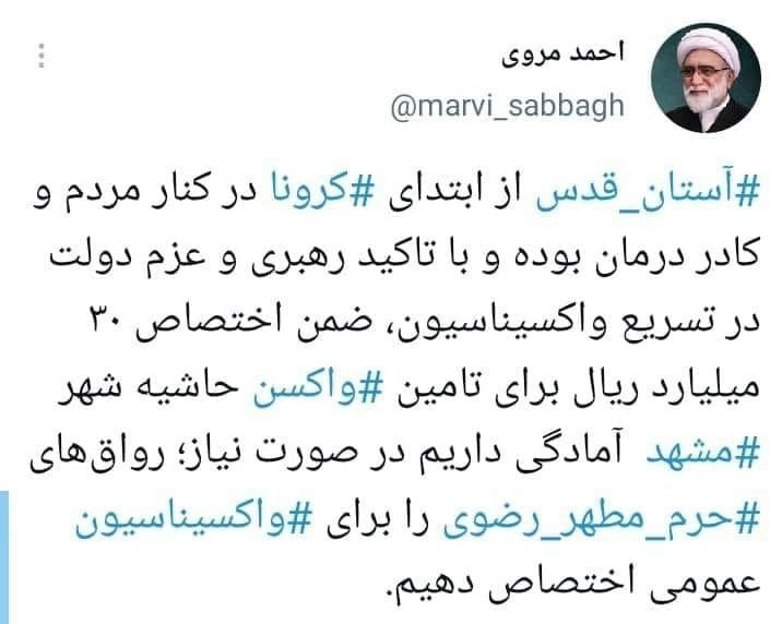 به گزارش خبرگزاری تسنیم از مشهد مقدس، حجت الاسلام و المسلمین احمد مروی شب گذشته با انتشار توییتی در فضای مجازی، از کمک سه میلیارد تومانی آستان قدس برای تامین واکسن حاشیه شهر خبر داد.
