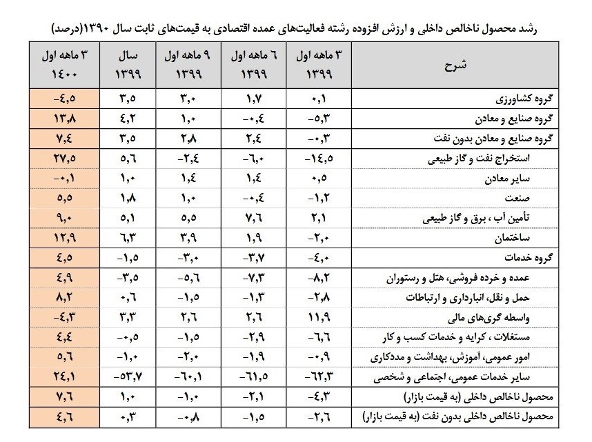 بر اساس آخرین نتایج حسابهای ملی فصلی مرکز آمار ایران، محصول ناخالص داخلی (GDP) بهقیمت ثابت سال 1390 در سهماهه اول سال 1400 به رقم ١٧٧٧ هزار میلیارد ریال با نفت و 1509 هزار میلیارد ریال بدون احتساب نفت رسیده است، در حالی که رقم مذکور در فصل مشابه سال قبل با نفت ١٦٥٢ هزار میلیارد ریال و بدون نفت ١٤٤٢ هزار میلیارد ریال بوده است که نشان از رشد ٧,٦درصدی محصول ناخالص داخلی با نفت و ٤.٦درصدی محصول ناخالص داخلی بدون نفت در فصل بهار سال 1400 دارد.