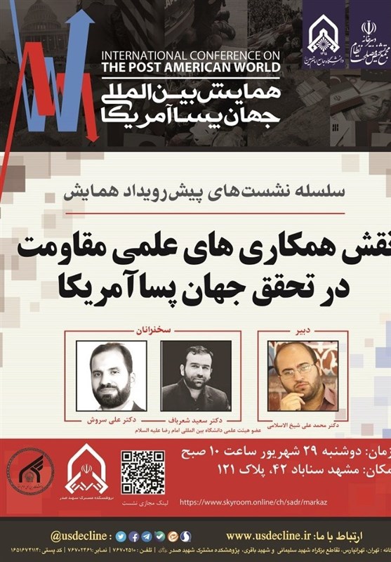 به گزارش خبرگزاری تسنیم از مشهد مقدس، سومین نشست از سلسله نشست‌های پیش‌ از برگزاری همایش بین‌المللی "افول آمریکا: جهان پساآمریکا" با عنوان «نقش همکاری‌های علمی مقاومت در تحقق جهان پسا‌آمریکا» ‌ با مشارکت دانشگاه بین‌المللی امام رضا(ع) و با حضور دکتر سعید شعرباف، عضو هیئت علمی این دانشگاه و دکتر علی سروش عضو هیئت علمی پژوهشکده شهید صدر(ره) دانشگاه جامع امام حسین علیه السلام در مشهد مقدس برگزار شد.