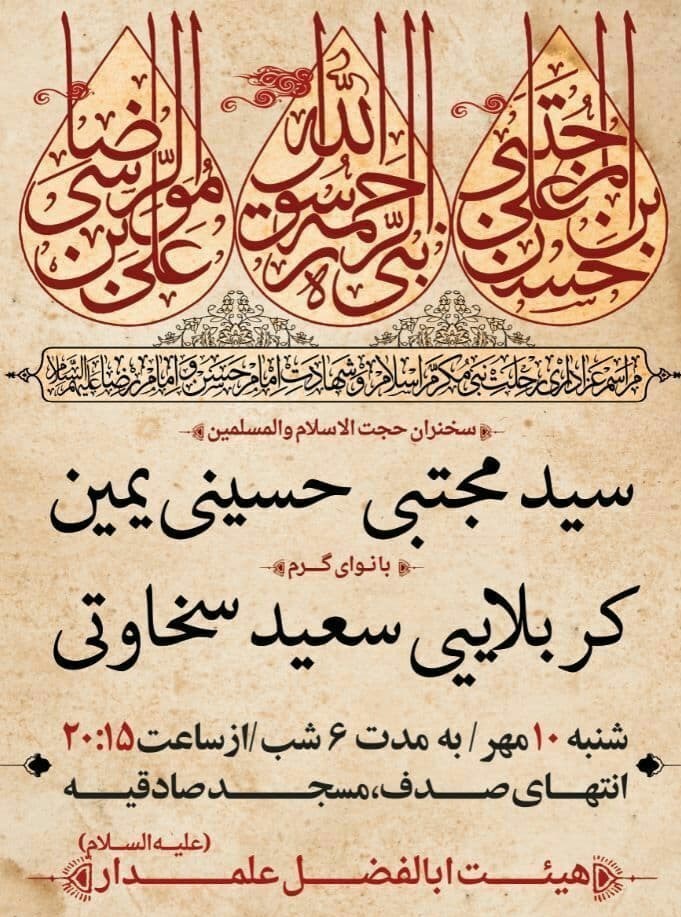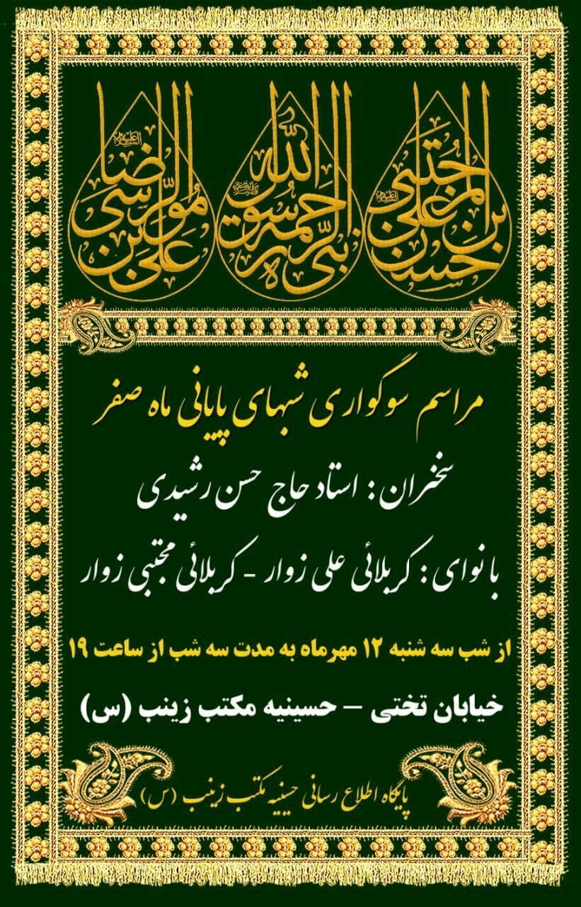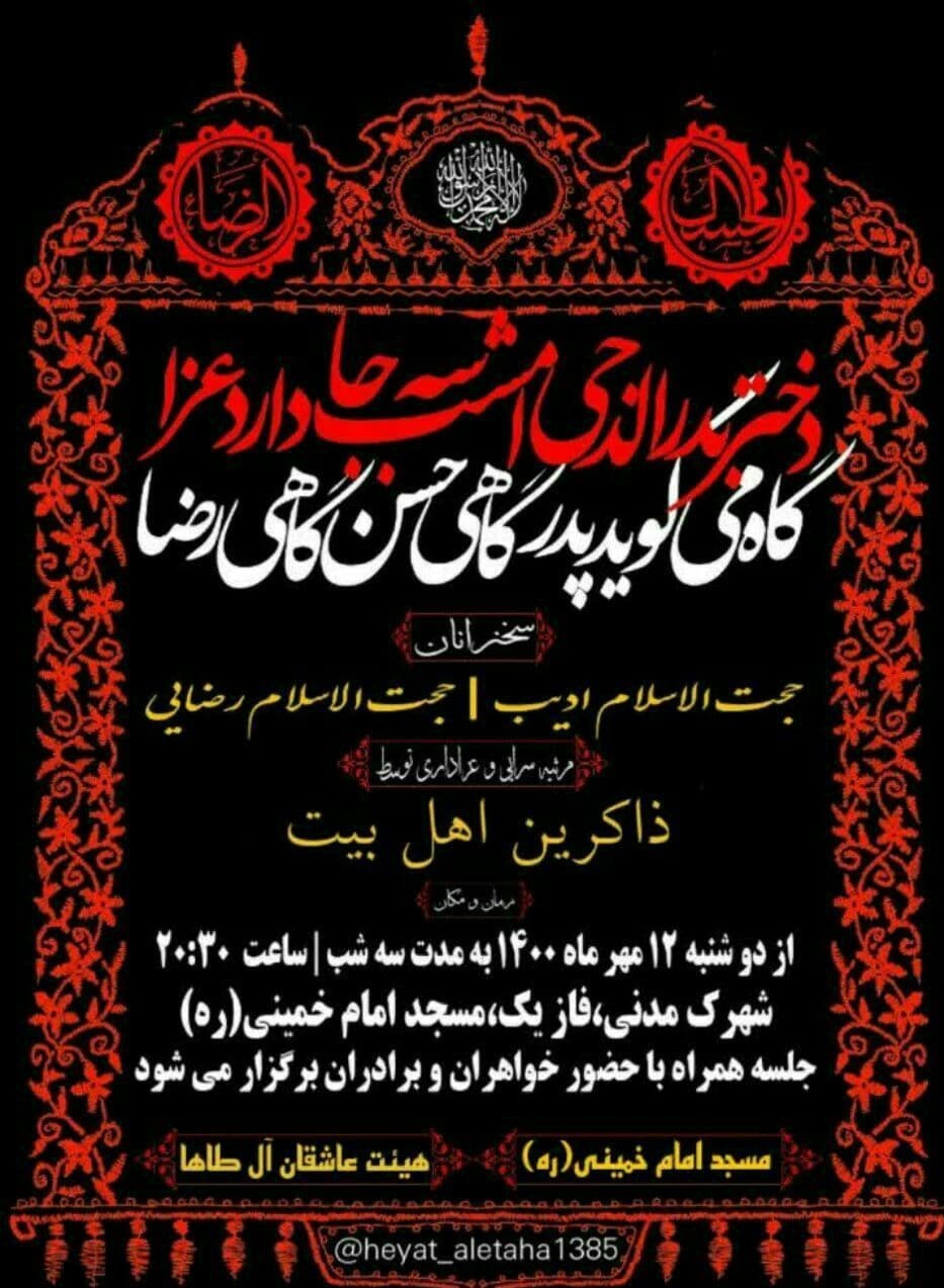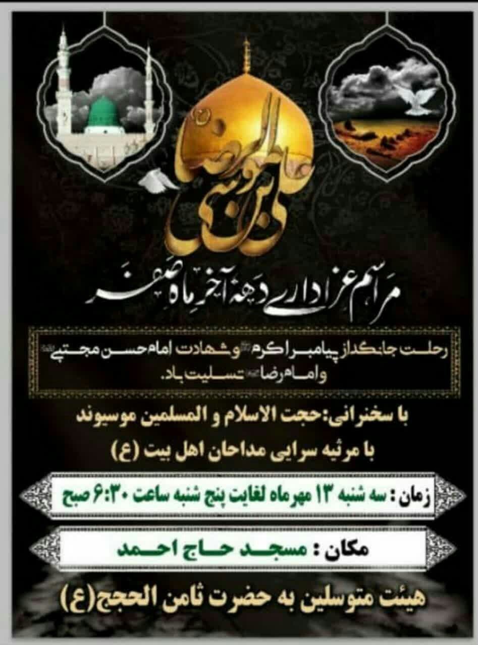 به همین مناسبت خبرگزاری تسنیم برنامههای هیئتهای مذهبی همدان و محافلی را که در شب و روز شهادت امام رضا(ع)، امام حسن مجتبی و رحلت جان سوز پیامبر اکرم(ص) اقدام به برپایی مراسم عزاداری و ذکر میکنند، جهت دسترسی بهتر و سریعتر مخاطبان به تفکیک زمان و نشانی هیئت بر اساس زیر منتشر کرده است.