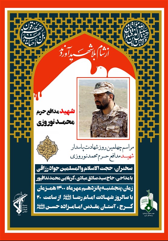 به گزارش خبرنگار فرهنگی خبرگزاری تسنیم، مراسم اربعین شهید شیمیایی مدافع حرم، «محمد نوروزی»، در روز پنجشنبه 15 مهرماه 1400 همزمان با سالروز شهادت امام رضا(ع) برگزار می شود. این مراسم از ساعت 20 در آستان مقدس امامزاده حسن کرج برپا خواهد شد. بزرگداشت چهلمین روز شهادت شهید محمد نوروزی با سخنرانی حجت الاسلام والمسلمین جواد رزاقی و مدیحه سرایی سید صادق عبادی و محمد نداف پور همراه خواهد بود.