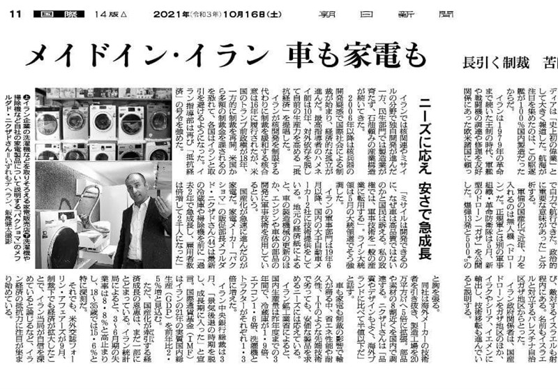 به گزارش خبرگزاری تسنیم، در این گزارش آقای کنتا ایجیما خبرنگار اعزامی روزنامه آساهی (Asahi) ژاپن با مراجعه به کارخانه های تولیدی لوازم خانگی ایران از جمله گروه پاکشوما در مورد رشد تولید و فروش محصولات تولیدی برندهای ایرانی این گروه طی 2 سال اخیر با توجه به تحریم های سیاسی و اقتصادی بین المللی با مدیر ارشد بازاریابی گروه پاکشوما پرداخت.