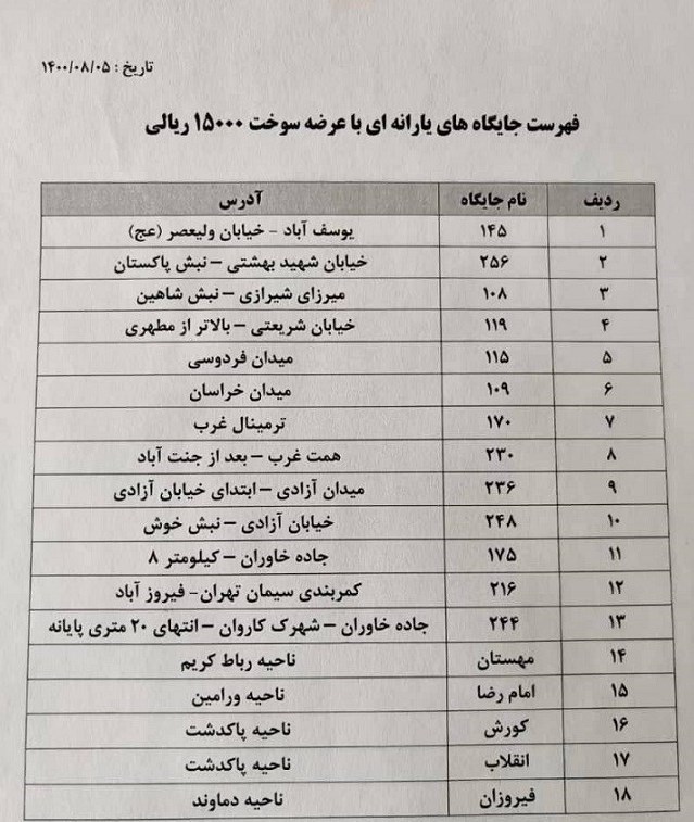 به گزارش خبرگزاری تسنیم به نقل از پایگاه اطلاع رسانی شرکت ملی پالایش و پخش فرآورده های نفتی ایران، در پی تلاش دست اندرکاران برای بازگرداندن جایگاه های عرضه سوخت به مدار سوخت رسانی و برطرف کردن اختلال بوجودآمده در سامانه هوشمند سوخت فهرست جایگاه های فعال عرضه سوخت سهمیه ای در سطح منطقه تهران اعلام شد.