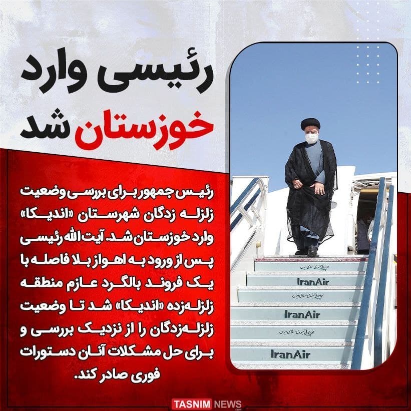 آیتالله سیدابراهیم رئیسی که صبح امروز از طریق فرودگاه دزفول وارد استان خوزستان شده بود، ساعتی پیش وارد شهرستان اندیکا شد. وی در این سفر از مناطق زلزله زده شهرستان اندیکا بازدید و از روند کمک رسانی و بازسازی این مناطق دیدن میکند.در این بازدید محمد مخبر ، معاون اول رئیس جمهور ، حجت الاسلام و المسلمین رئیسی را همراهی می کند.