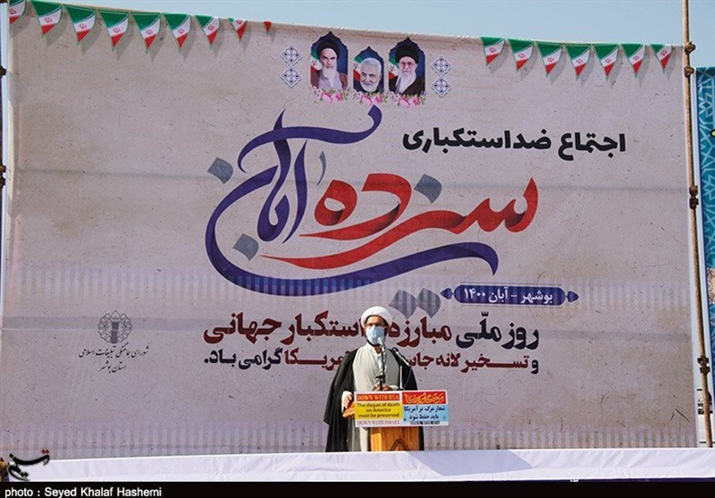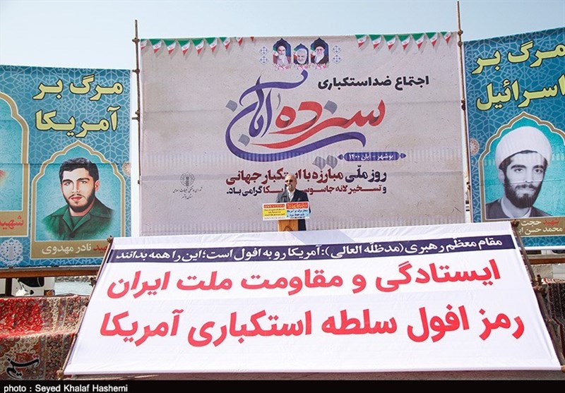به گزارش خبرگزاری تسنیم از بوشهر، همزمان با 13 آبان روز ملی مبارزه با استکبار جهانی مردم ولایتمدار استان در همه شهرها و روستاها با اجتماع با شکوه انزجار خود را از آمریکا، رژیم صهیونیستی، حامیان و همپیمانان استکبار جهانی اعلام کردند.