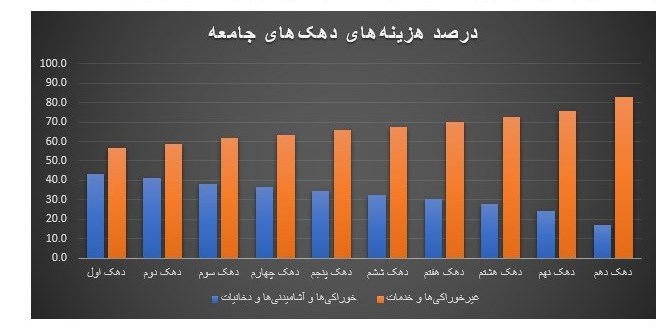 همانطور که در جدول فوق ملاحظه میکنید؛ کالاهای اساسی مانند هزینه خوراکیها و هزینه مسکن بیشترین سهم را بین هزینههای دهکهای پایین جامعه تشکیل میدهند، در نتیجه لازم است سیاست حمایتی مناسبی جهت تأمین مایحتاج ضروری این دهکها اتخاذ گردد. ازآنجاکه بخش اعظمی از اقلام اساسی موردنیاز این دهک بهطور مستقیم یا باواسطه در زنجیره تولید خود به واردات مربوط میشود؛ تخصیص ارز ترجیحی به این اقلام امری ضروری است.