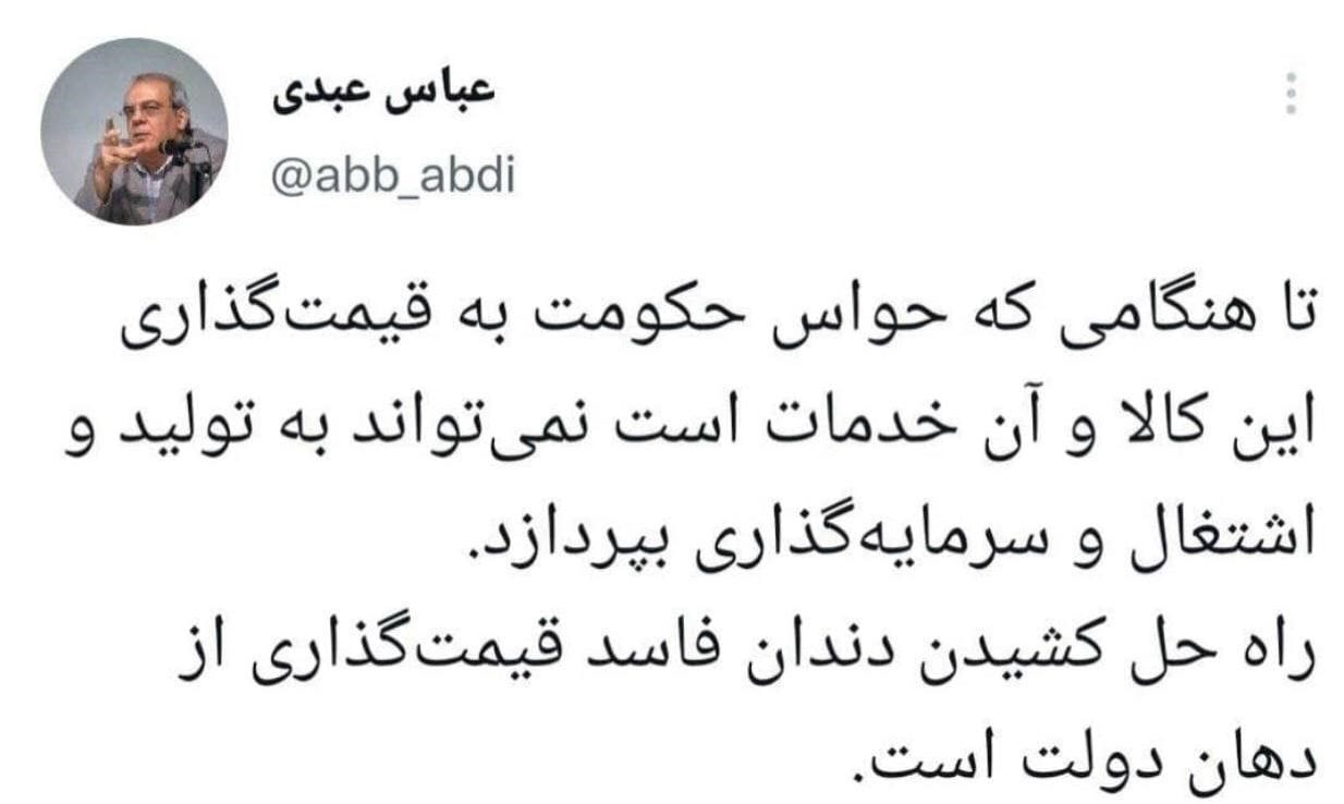 به گزارش خبرگزاری تسنیم، عباس عبدی فعال سیاسی اصلاح طلب که اخیراً زیاد در مورد موضوعات اقتصادی اظهار نظر می کند، در واکنش به دستور رئیس جمهور برای لغو گرانی اخیر خودرو در صفحه شخصی خود نوشت: تا هنگامی که حواس حکومت به قیمت گذاری این کالا و آن خدمات است، نمی تواند به تولید و اشتغال و سرمایه گذاری بپردازد. راه حل کشیدن دندان فاسد قیمت گذاری از دهان دولت است.