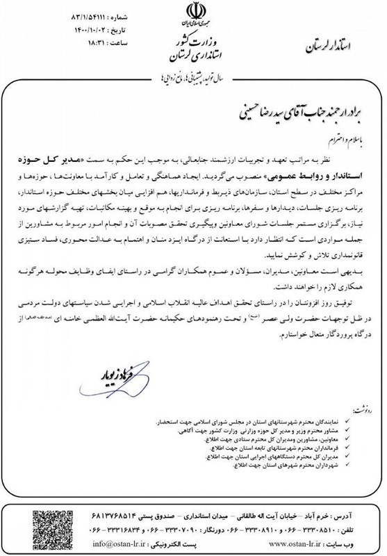 به گزارش خبرگزاری تسنیم از خرم آباد ، فرهاد زیویار استاندار لرستان با صدور حکمی سیدرضا حسینی را به عنوان مدیرکل حوزه استاندار و روابط عمومی منصوب کرد.