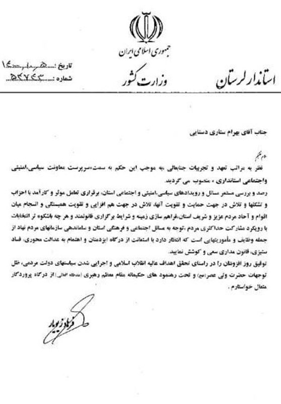به گزارش خبرگزاری تسنیم از خرمآباد، فرهاد زیویار طی حکمی بهرام ستاری دستنایی را به عنوان سرپرست معاونت سیاسی، امنیتی و اجتماعی استانداری لرستان منصوب کرد.