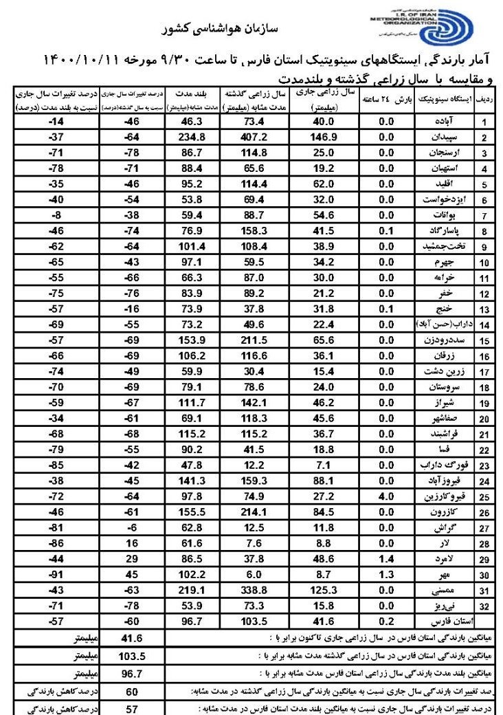 همچنین براساس آخرین تحلیل هواشناسی استان فارس تا صبح امروز میزان بارشها در سال زراعی جاری در استان به 41.6 درصد رسیده که نسبت به سال گذشته هنوز 60 درصد کاهش دیده میشود؛ این در حالی است که تا پیش از این سامانه بارشی اختلاف امسال و سال گذشته 85 درصد کاهش را نشان میداد.