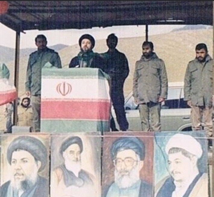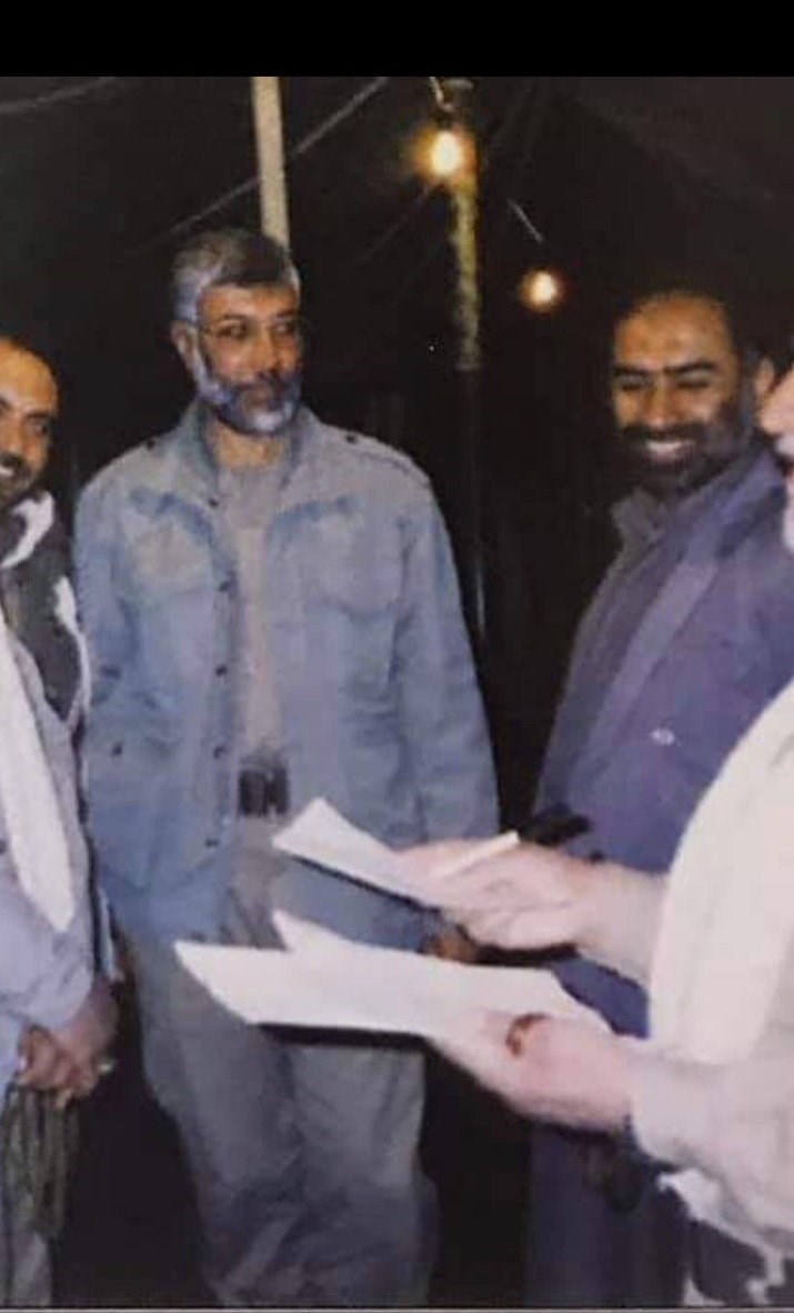 حاج ابوعلی کنار هادی العامری در مراسم سخنرانی شهید آیتالله محمدباقر حکیم در جمع مجاهدین سپاه بدر در دهه هفتاد