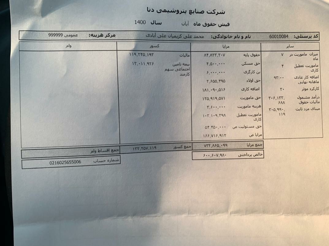براین اساس در فیش آبان‌ماه جمع حقوق و مزایا مدیرعامل عامل پتروشیمی دنا 732.865.099ریال درج شده است.