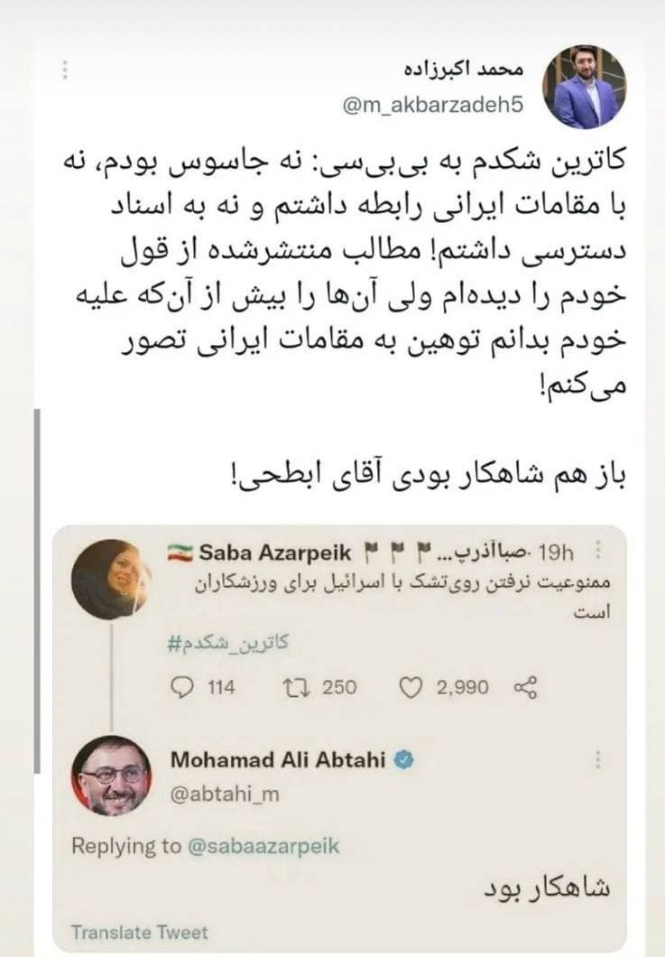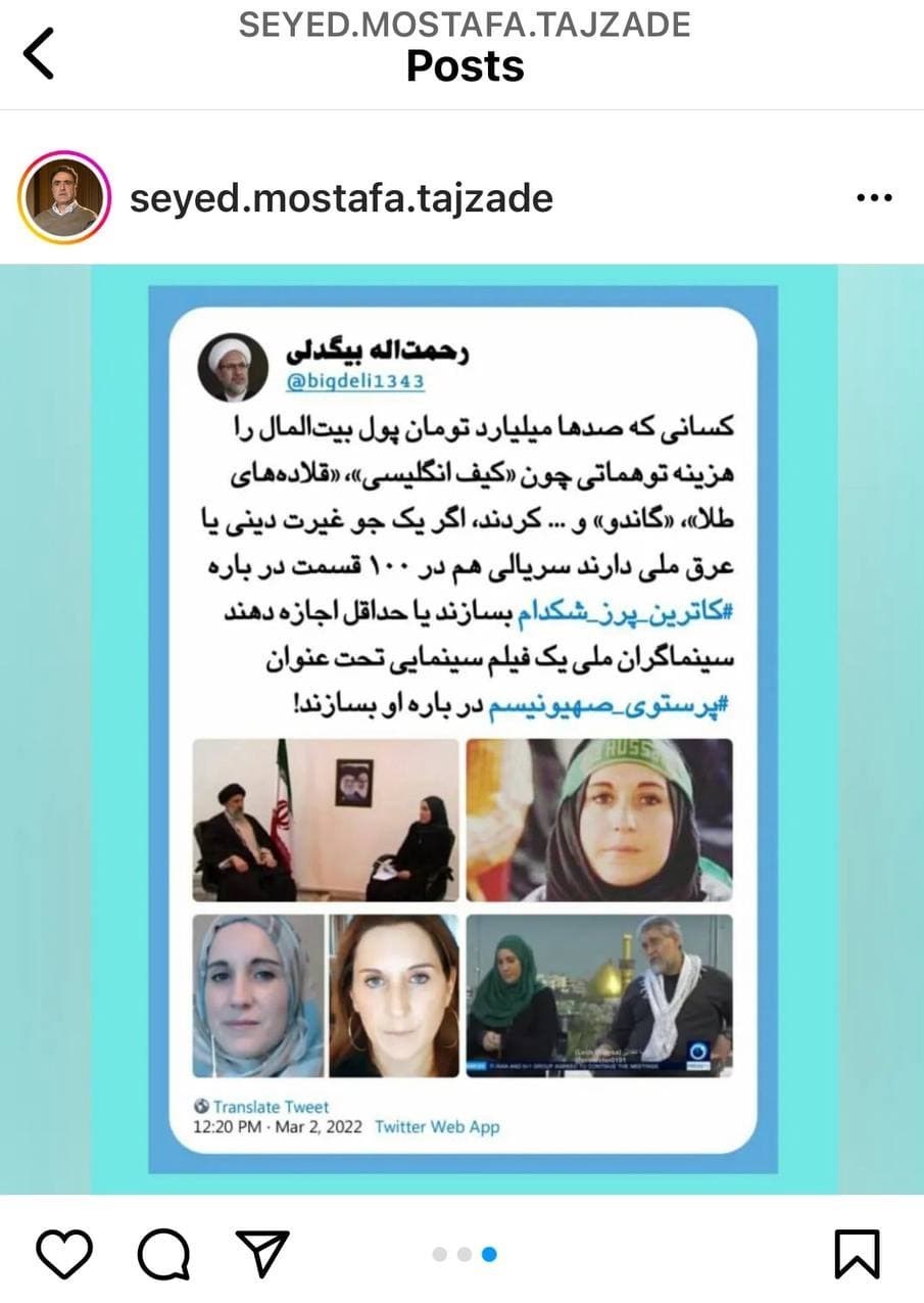 مسئله مهم این است که کانال احمدینژاد، برخی اکانتهای فیک و همچنین امثال تاجزاده و صدرالساداتی مطالبی را بهنقل از کاترین شکدم منتقل میکنند که او هم حتی اساساً آنها را مطرح نکرده است.