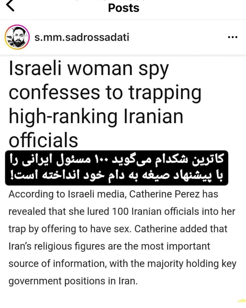 مهدی صدرالساداتی امّا احتمالاً تصور کرده موضوع را حرفهایتر پیش برده است! او در اینستاگرام خود به یک سایت انگلیسی ارجاع داده و نوشته است که کاترین شکدم با 100 مقام ایرانی رابطه صیغه داشته است! حال آنکه اگر آن سایت انگلیسی را هم جستوجو کنید، معلوم میشود که نه یک منبع رسمی است و نه مطالب آن اعتبار و ارزشی دارد بلکه خود آن سایت هم گفته است که چنین مسائلی در جای دیگری مطرح شده است! تنها تفاوت این سایت با جعلیات در گروهها و کانالهای فارسی این است که زبانش انگلیسی است و احتمالاً مخاطب با مشاهده زبان آن تصور کند که پس در سایتهای انگلیسی معتبری چنین مسائلی نوشته شده است و ماجرا واقعیت دارد! حال آنکه در این مسئله، صرفاً نوع کارپردازی برای وبلاگ اسرائیلی تفاوت میکند وگرنه اصل موضوع فرقی ندارد!