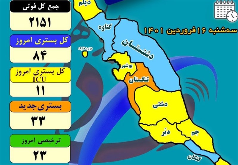 وی افزود: خوشبختانه در شبانهروز گذشته 23 بیمار بخش کرونایی با حال عمومی خوب از بیمارستانهای استان بوشهر ترخیص شدهاند.