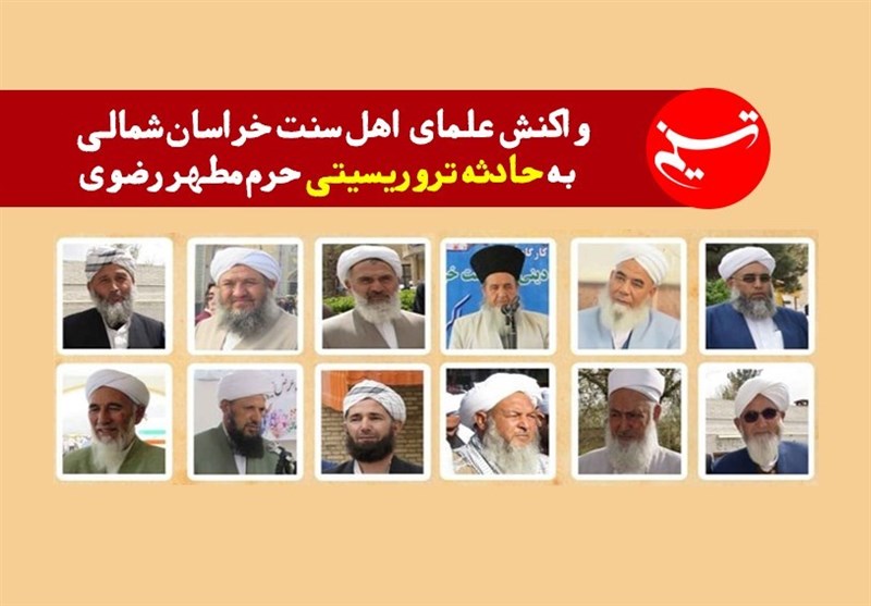 به گزارش خبرگزاری تسنیم از بجنورد٬ جمعی علمای اهل سنت خراسان شمالی با صدور بیانیهای با اعلام انزجار از عوامل حادثه تروریستی حرم مطهر رضوی اظهار داشتند: از عوامل امنیتی و اطلاعاتی میخواهیم هر چه زودتر بانیان حادثه حرم مطهر رضوی را به اشد مجازات برسانند.