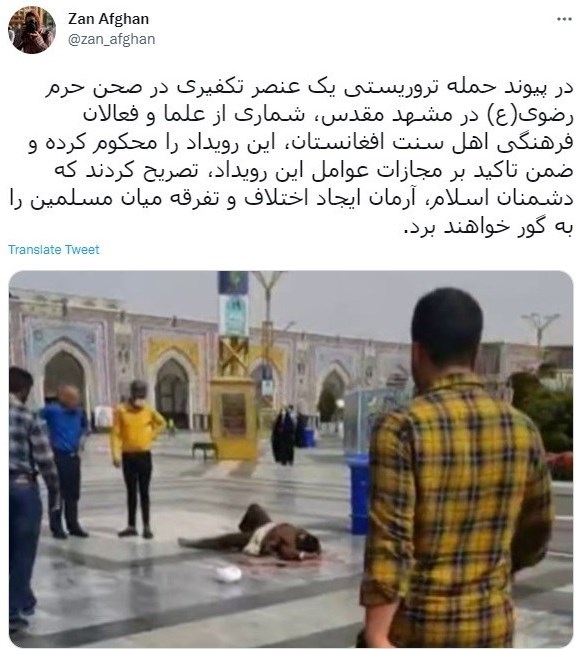 همزمان با این حادثه، کاربران و فعالان افغانستانی شبکههای اجتماعی با اعلام انزجار از عمل تروریستی ضارب در مشهد مقدس، خود را در این غم با مردم ایران شریک دانسته همدردی کردند.