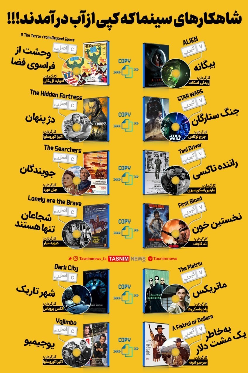 در تصویر زیر برخی از فیلم‌های بزرگ تاریخ سینمای جهان را که با کپی‌کاری و تقلید ساخته شده‌اند را مشاهده کنید.