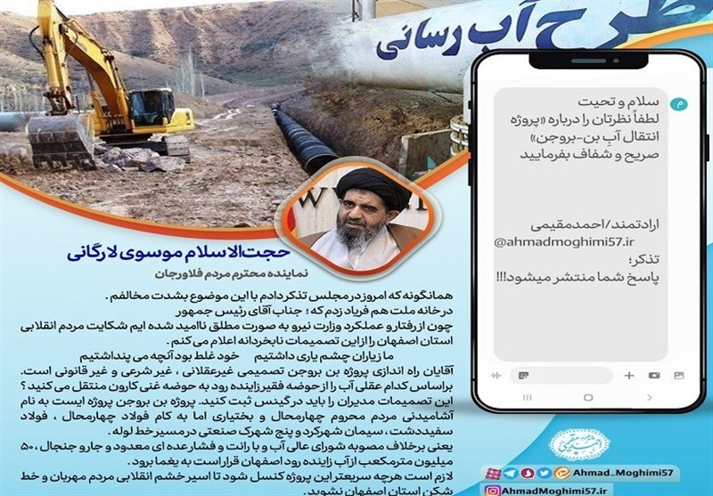 در همین راستا، مقیمی، از چهره‌های مطالبه‌گر اصفهان، در پویشی به پرسش از نمایندگان استان اصفهان در مجلس شورای اسلامی پیرامون این پروژه پرداخت و نظر این نمایندگان را درباره آن جویا شد. از میان 18 نماینده مردم اصفهان در مجلس شورای اسلامی 13 نفر از آنها نظر خود را نسبت به تأمین آب پروژه انتقال آب بن ـ بروجن از حوضه آبریز زاینده‌رود اعلام داشتند که در این میان برخی از نمایندگان همچون «سید ناصر موسوی لارگانی» نماینده مردم فلاورجان در مجلس شورای اسلامی و «حسین رجایی ریزی»، نماینده مردم لنجان در مجلس شورای اسلامی انجام این پروژه و انتقال آب به آن را علاوه بر غیرقانونی بودن، غیرشرعی نیز دانسته‌اند.