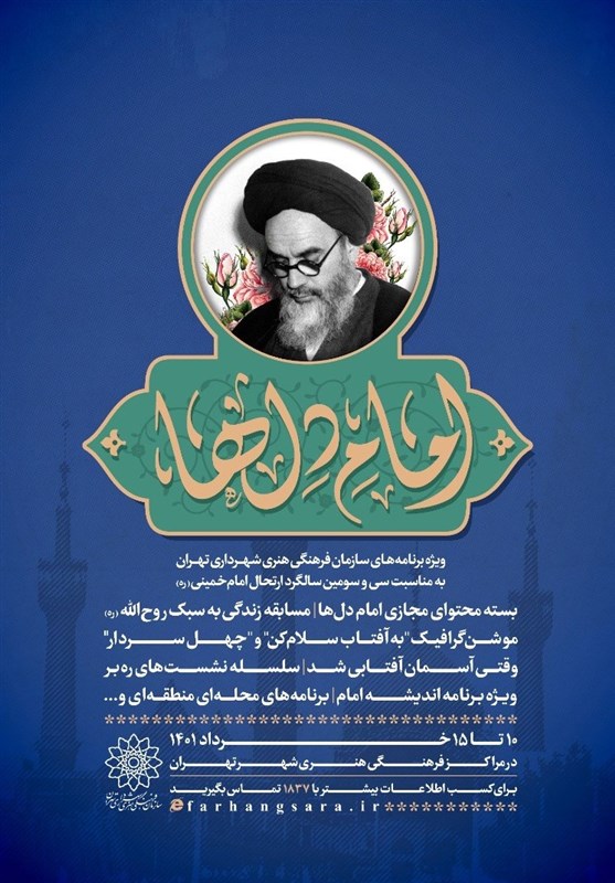 به گزارش خبرگزاری تسنیم، سید علیرضا فاطمیان‌پور معاون فرهنگی سازمان فرهنگی هنری شهرداری تهران از برگزاری ویژه‌برنامه‌های «امام دل‌ها» به مناسبت سی و سومین سالگرد ارتحال امام خمینی(ره) خبر داد و گفت: 87 عنوان برنامه با 191 اجرا با رویکرد افزایش آگاهی مردم درباره جایگاه رهبری و ولایت فقیه، معرفی سبک زندگی و ابعاد شخصیتی امام خمینی(ره) و ترویج و نشر اندیشه‌های امام خمینی(ره) پیش‌بینی شده است.