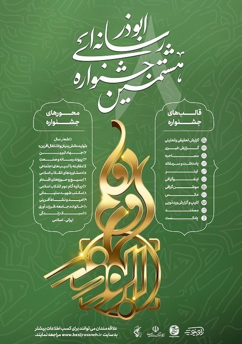 وی بیان کرد: هشتمین جشنواره رسانهای ابوذر در قالبهای گزارش خبری، گزارش تحقیقی و تحلیلی، مصاحبه، یادداشت، سرمقاله، تیتر، اینفوگرافی، موشنگرافی، عکس، کلیپ گزارش ویدیوئی، مستند ویدیوئی و پادکست برگزار میشود.