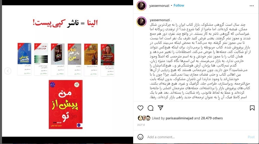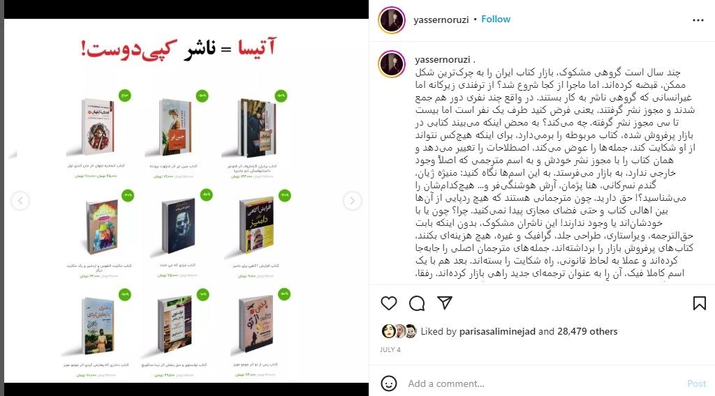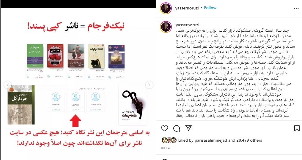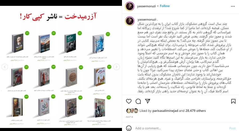 نوروزی در این پست خود اعلام کرده است که ناشرانی چون آسو، پرثوآ، داریوش، آتیسا، آزرمیدخت، نیکفرجام، زرینکلک، نگین ایران، ندای معاصر، شاهدخت پاییز، آراستگان، راز معاصر، سپهر ادب و.... از جمله ناشران کتابساز هستند که آثار ناشران دیگر را کپی میکنند. گویا این موضوع با اعتراض برخی از این ناشران مواجه شده است.