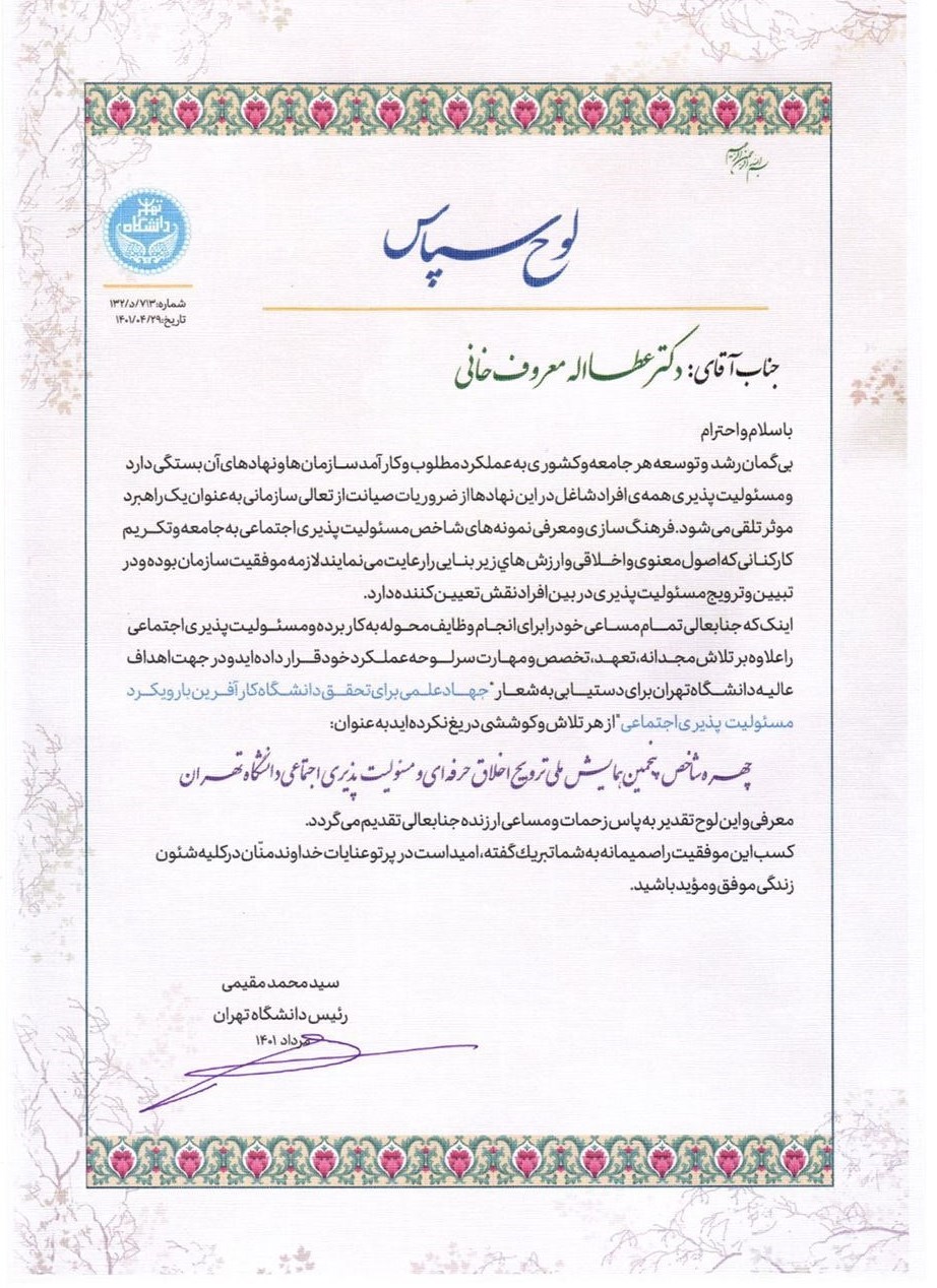 اینکه جنابعالی تمام مساعی خود را برای انجام وظایف محوله به کار برده و مسئولیتپذیری اجتماعی را علاوه بر تلاش مجدانه تعهد، تخصص و مهارت را سرلوحه عملکرد خود قرار دادهاید و در جهت اهداف عالیه دانشگاه تهران برای دستیابی به شعار 《جهاد علمی برای تحقق دانشگاه کارآفرین با رویکرد مسئولیتپذیری اجتماعی》از هر تلاش و کوششی دریغ نکردهاید، به عنوان 《چهره شاخص پنجمین همایش ملی ترویج اخلاق حرفهای و مسئولیتپذیری اجتماعی دانشگاه تهران》معرفی و این لوح تقدیر به پاس زحمات و مساعی ارزنده جنابعالی تقدیم میگردد.