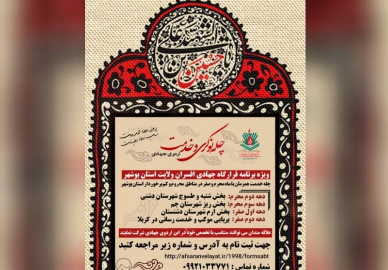 مسئول گروه جهادی افسران ولایت استان بوشهر از اجرا طرح "چله نوکری" و "خدمت جهادی" با شعار روزهای خدمت و شب‌های هیئت در استان بوشهر خبر داد.