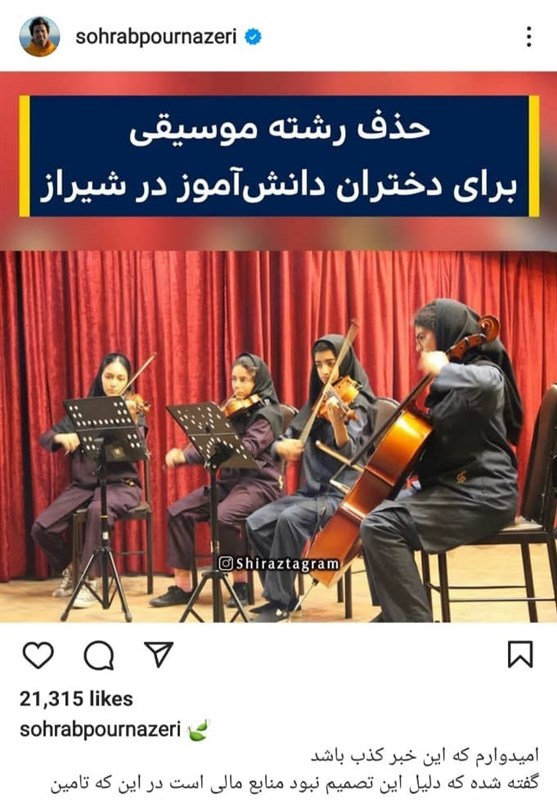 یکی از مسئولان آموزش و پرورش شیراز هم خبرِ حذف رشته موسیقی برای دختران را تکذیب و اعلام کرد که این دختران طیِ یک هفته الی 10 روز آینده در رشته موسیقی ثبت نام خواهند شد.