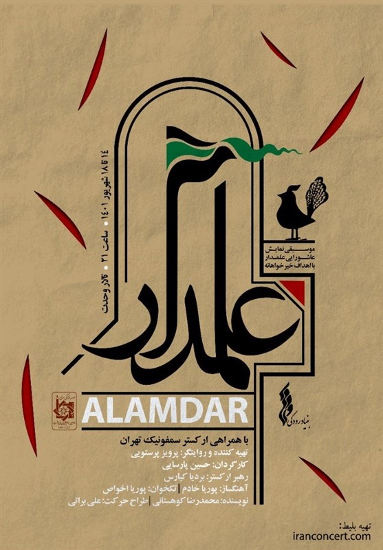 به گزارش خبرگزاری تسنیم، «علمدار» با همراهی ارکستر سمفونیک تهران در ایّام منتهی به اربعین حسینی از 14 تا 18 شهریور ماه به همت بنیاد رودکی و با همکاری مؤسسه خیریه «خادمین امام علی بن ابی طالب (ع)» اجرا می‌شود.