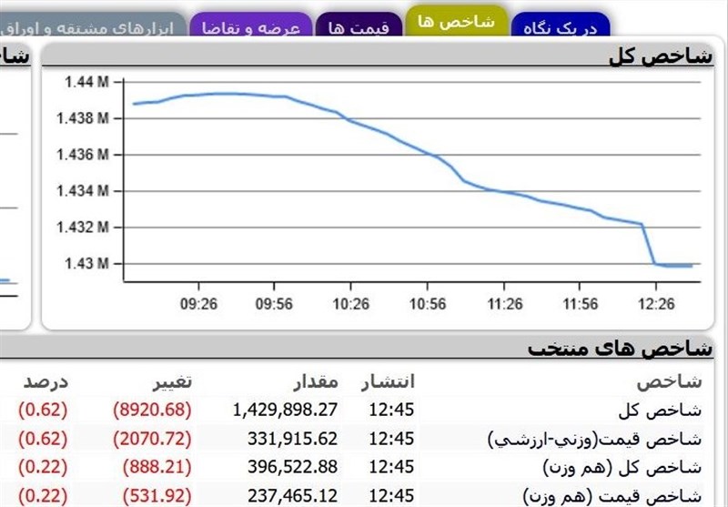 به گزارش خبرنگار اقتصادی خبرگزاری تسنیم، در جریان دادوستدهای امروز بازار سرمایه بیش از 5 میلیارد و 512 میلیون سهم و حقتقدم بهارزشی بالغ بر 2 هزار و 944 میلیارد تومان در بیش از 294 هزار نوبت مورد دادوستد قرار گرفت و شاخص بورس با افت 8 هزار و 920 واحدی در ارتفاع یک میلیون و 429 هزار و 898 واحد قرار گرفت.