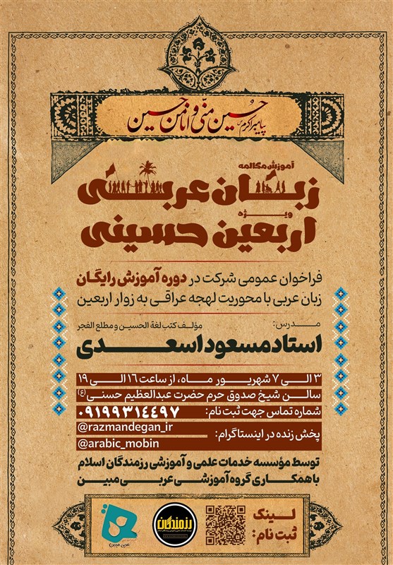 به گزارش خبرگزاری تسنیم، فاطمینژاد مدیرعامل مؤسسه علمی رزمندگان در این باره اظهار داشت: دوره سراسری آموزش مکالمه زبان عربی ویژه پیادهروی اربعین حسینی، به همت مؤسسه خدمات علمی و آموزشی رزمندگان اسلام و با همکاری گروه آموزشی عربی مبین، ویژه علاقهمندان سراسر کشور، به صورت حضوری و مجازی برگزار میشود. در این دوره آموزشی رایگان، استاد مسعود اسعدی، از اساتید مطرح و بنام زبان عربی، مؤلف کتب لغتالحسین و مطلعالفجر و سایر اساتید مطرح زبان عربی حضور خواهند داشت.