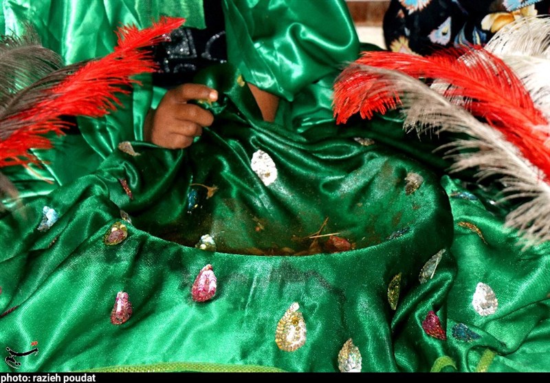 با خواندن دو بیتی توسط میانسالان و زنان با سواد مجلس و هم خوانی و همراهی سایرین، دختر نابالغی به نام فاطمه یا زهرا که از قبل وی را استحمام کرده اند و لباس نو و تمیز پوشانده و پارچه ای سبز بر سر او انداخته اند دست راست خود را درون ظرف می کند و وسایل موجود در آن را بهم می زند.