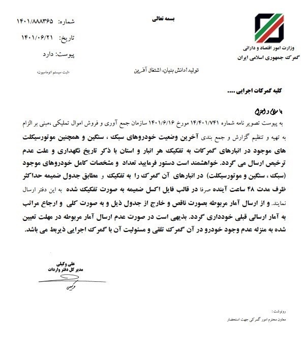 به دنبال این نامه که در تاریخ 16 شهریور ماه ارسال شده بود، گمرک ایران به تمامی گمرکات اجرایی اعلام کرده است که آخرین وضعیت خودروهای سبک، سنگین و همچنین موتورسیکلت های موجود در انبارهای گمرکات به تفکیک هر انبار و استان با ذکر تاریخ نگهداری و علت عدم ترخیص آن را اعلام کنند.