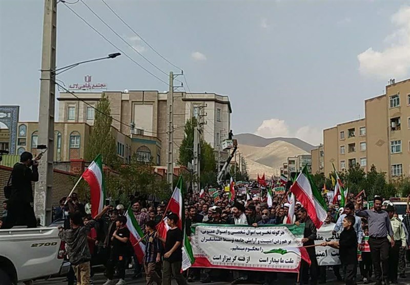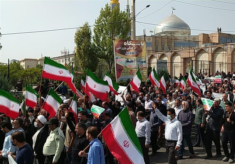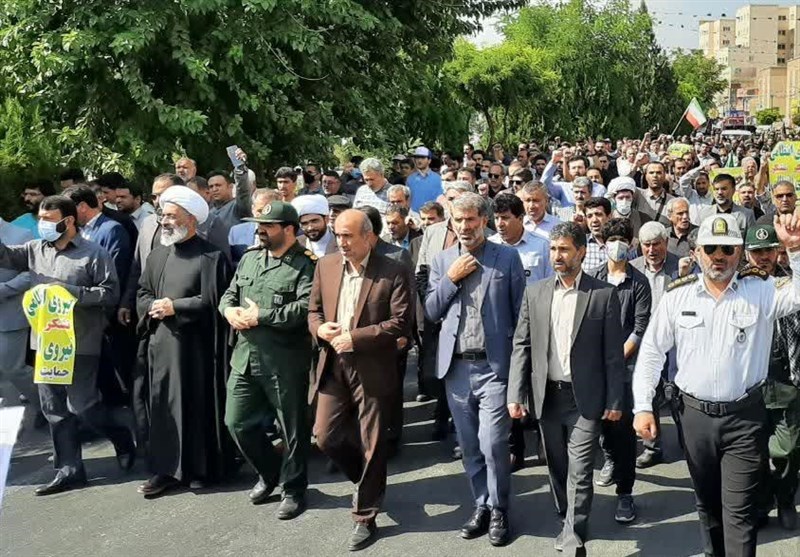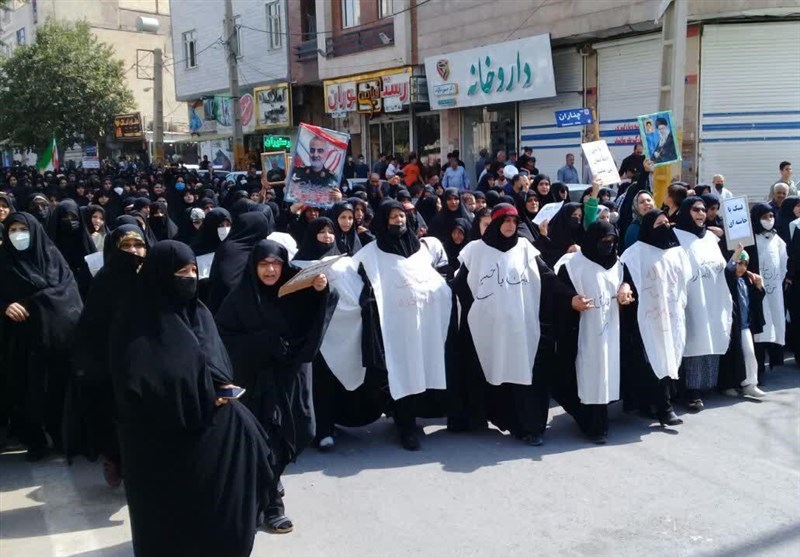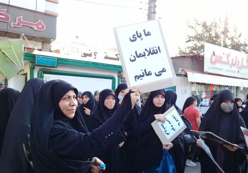 براساس این گزارش راهپیمایان تصاویری از رهبر انقلاب، سردار شهید سلیمانی و پرچم ایران در دست داشتند.
