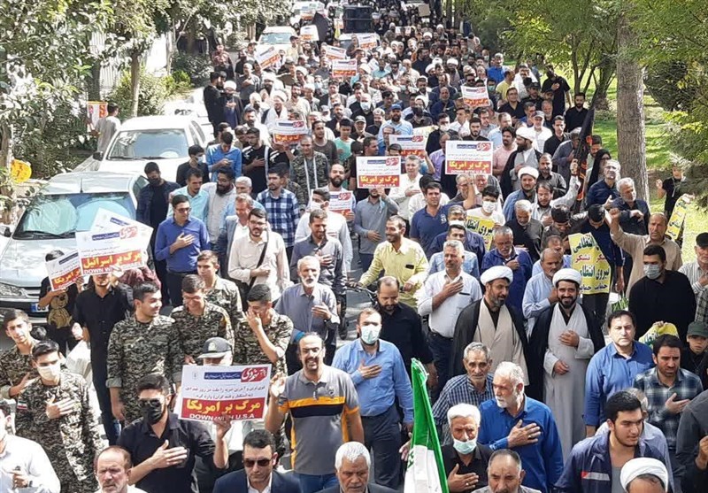 مردم 16 شهرستان استان تهران در این آئین حضوری گسترده داشتند و شعار مرگ بر آمریکا، مرگ بر منافق، مرگ بر فتنهگر و خونی که در رگ ماست هدیه به رهبر ماست سر دادند.
