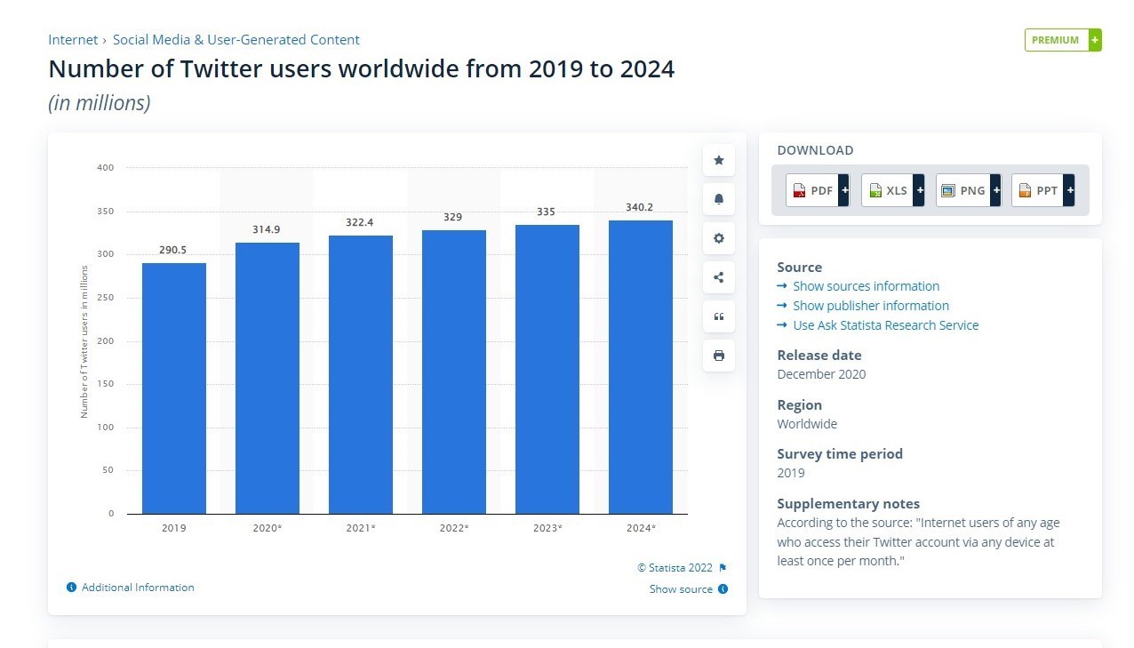 اول ـ مجموع کاربران توئیتر در جهان چقدر است؟ پایگاه آماری استاتیستا (statista) آلمان روز 5 مرداد 1401 تعداد کل کاربران توئیتر را منتشر کرد. طبق این آمار، کاربران توئیتر در سال 2019 برابر با 290 میلیون نفر، در سال 2020 برابر با 314.9 میلیون نفر، در سال 2021 برابر با 322.4 میلیون نفر گزارش شد. کل کاربران توئیتر در سال 2022 میلادی 329 میلیون نفر در سراسر جهان تخمین زده شد.[1]