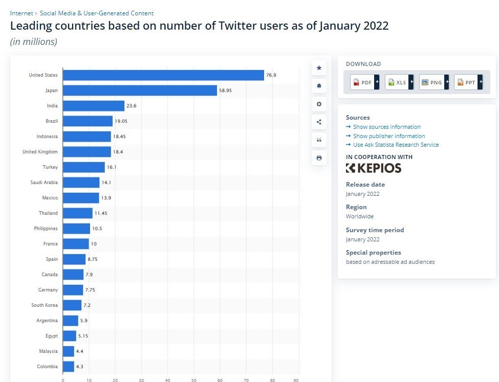 دوم ـ تعداد کاربران ایرانی توئیتر چقدر است؟ پایگاه آماری استاتیستا (statista) آلمان در گزارش آماری دیگری فهرست 20 کشور برتر دارای بیشترین کاربر فعال توئیتر در جهان را منتشر کرد.