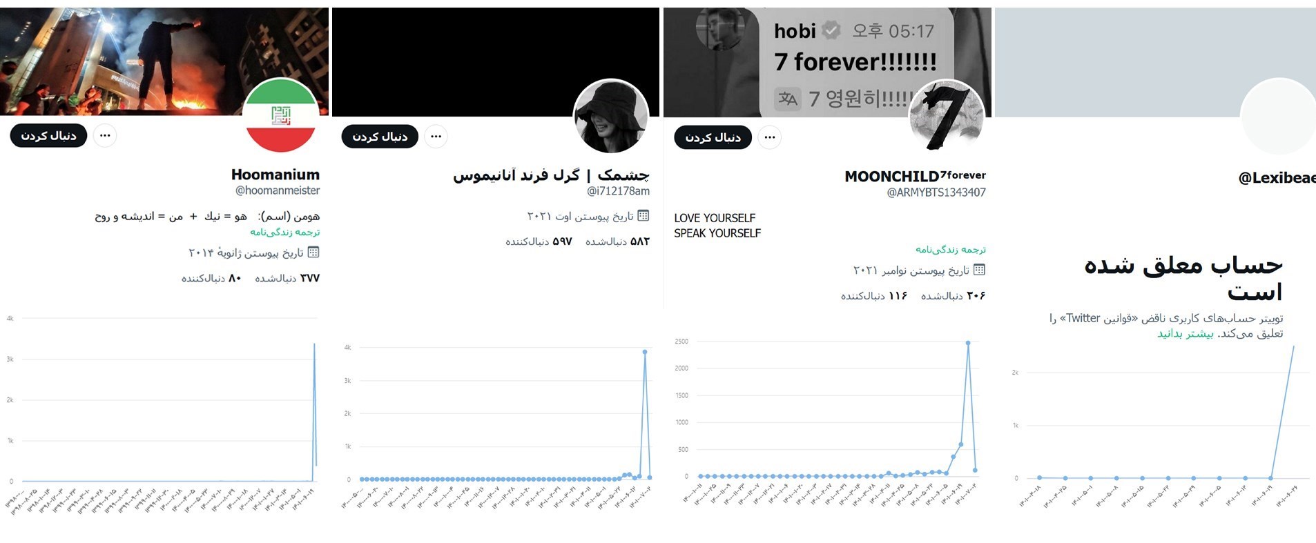1:اکانت هومنیوم (hoomanium) هشت سال قبل ایجاد شد. این کانت طی 8 سال فقط 2 توئیت زده ولی از 19 شهریور فعال‌شد و در 26 شهریور با حدود 3500 توئیت و ریتوئیت به اوج رسید.