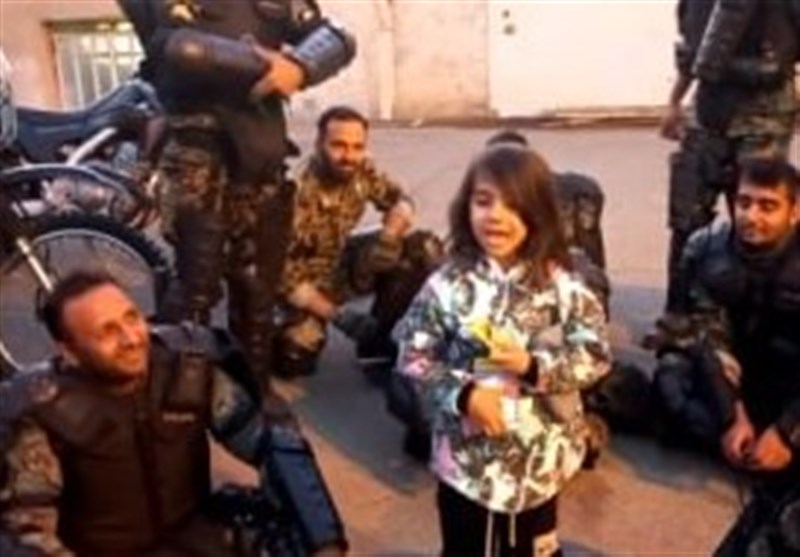 یک دختر خردسال در میان مأموران یگان ویژه در حال شیرین‌زبانی است!