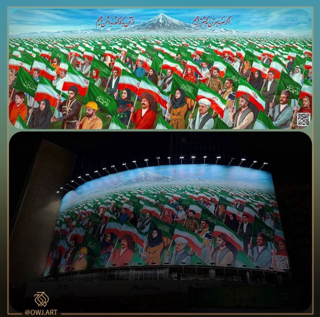 بهگزارش خبرنگار فرهنگی تسنیم، بامداد امروز دیوارنگاره جدید میدان ولیعصر(عج) پایتخت با شعار #ایران_یکپارچه رونمایی شد.
